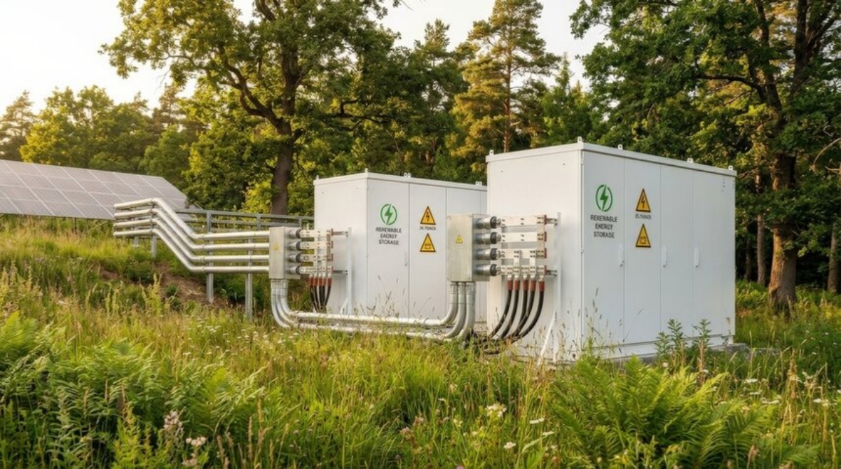Renewable energy storage uses high-voltage battery cabinets to keep extra power from solar or wind.